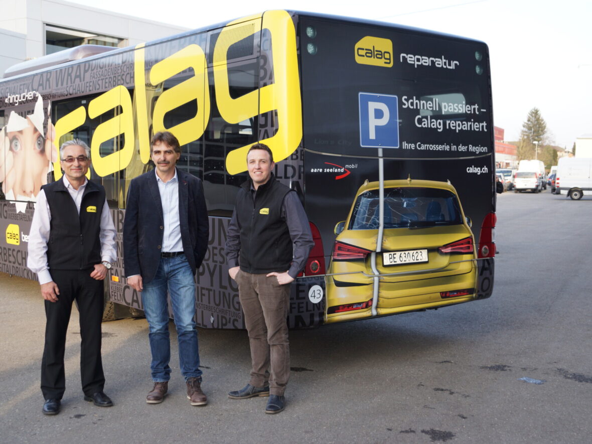 Bis letzte Woche waren es noch die drei Felber-, Giesser- und Renet-Busse, welche mit ihrer Vollfolierung auffielen. Seit dem 16. März 2015 zieht nun ein weiterer komplett eingehüllter Linienbus der Aare Seeland mobil AG durch die Region: Der Calag-Bus.