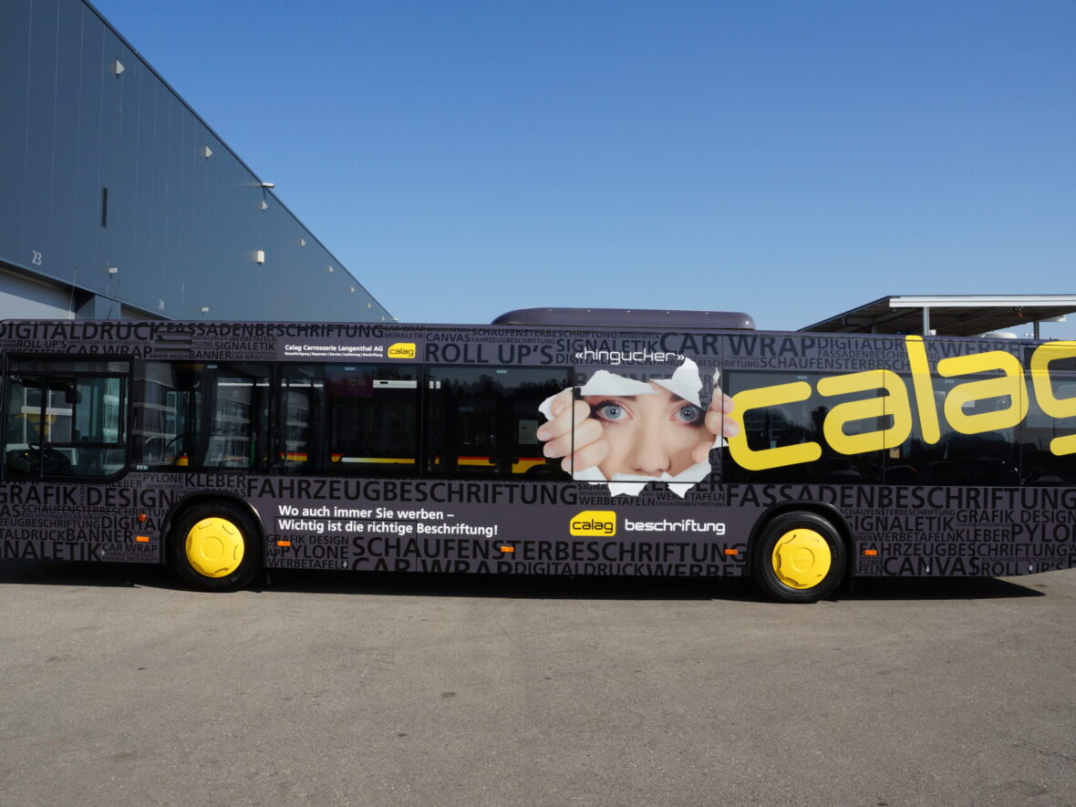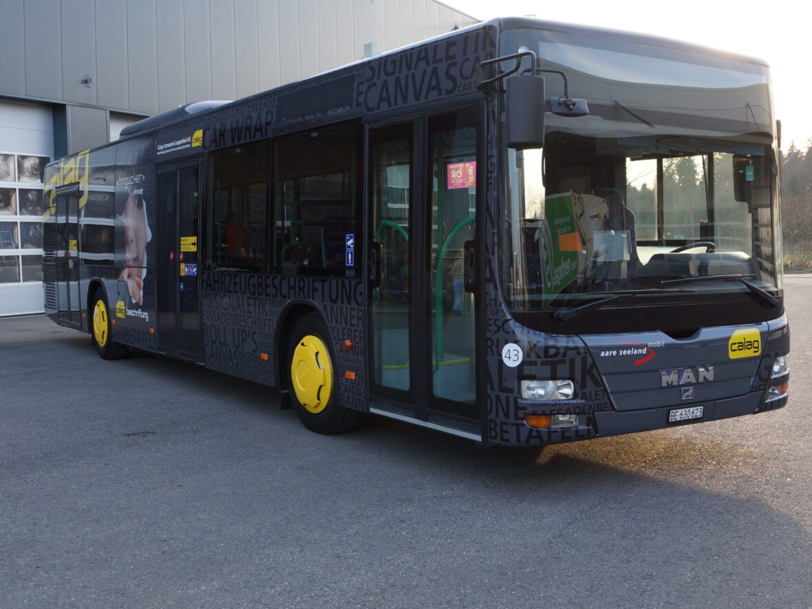 Bis letzte Woche waren es noch die drei Felber-, Giesser- und Renet-Busse, welche mit ihrer Vollfolierung auffielen. Seit dem 16. März 2015 zieht nun ein weiterer komplett eingehüllter Linienbus der Aare Seeland mobil AG durch die Region: Der Calag-Bus.