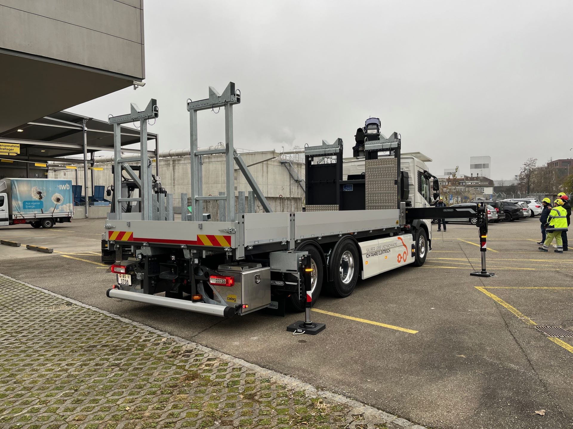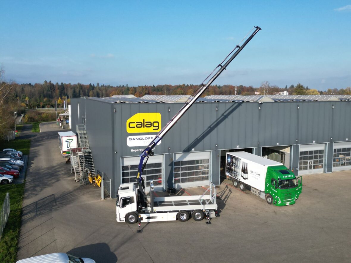 Die Wahl fiel deshalb auf den Volvo FM Elektro mit einem Palfinger PK 245 TEC E Kranaufbau und einer Calag Spezialladebrücke. Den Aufbau des Ladekrans auf den elektrisch betriebenen Volvo übernahm das Team der Calag. Beim Fahrzeug – einem elektrisch angetriebenen Volvo mit Ladekran dieser Grösse – handelt es sich um eine Premiere in der Schweiz.