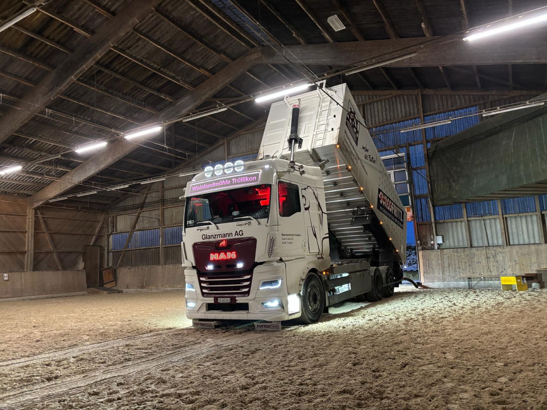 Aufgebaut auf einem MAN TGX 26.520 6×2-4 bietet der neue Losegut-Kippaufbau alles, was es für einen effizienten Futtermitteltransport braucht. Der robuste, langlebige Kastenaufbau kombiniert Langlebigkeit mit einem hohen Grad an Flexibilität. Ideal für die vielseitigen Anwendungen bei der Weinlandmühle.