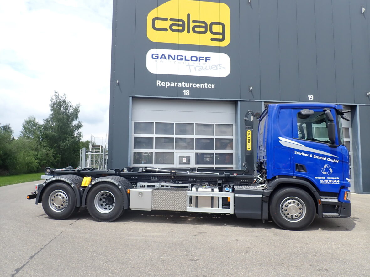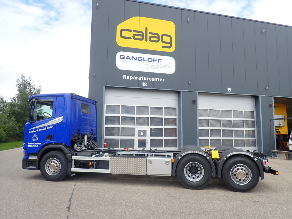 Der Wechsel der Aufbauten geht dank dem Calag Schnellwechselsystem sehr schnell und benötigt nur wenige Handgriffe des Fahrers. Die Vollluftfederung des Scania erlaubt ein einfaches Absenken und Anheben des Chassis während das hydraulische Schubsystems den Aufbau zuverlässig in den SWS Rahmenschuhe verankert.