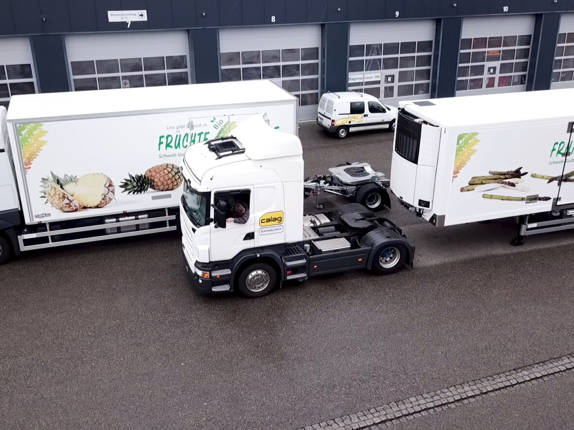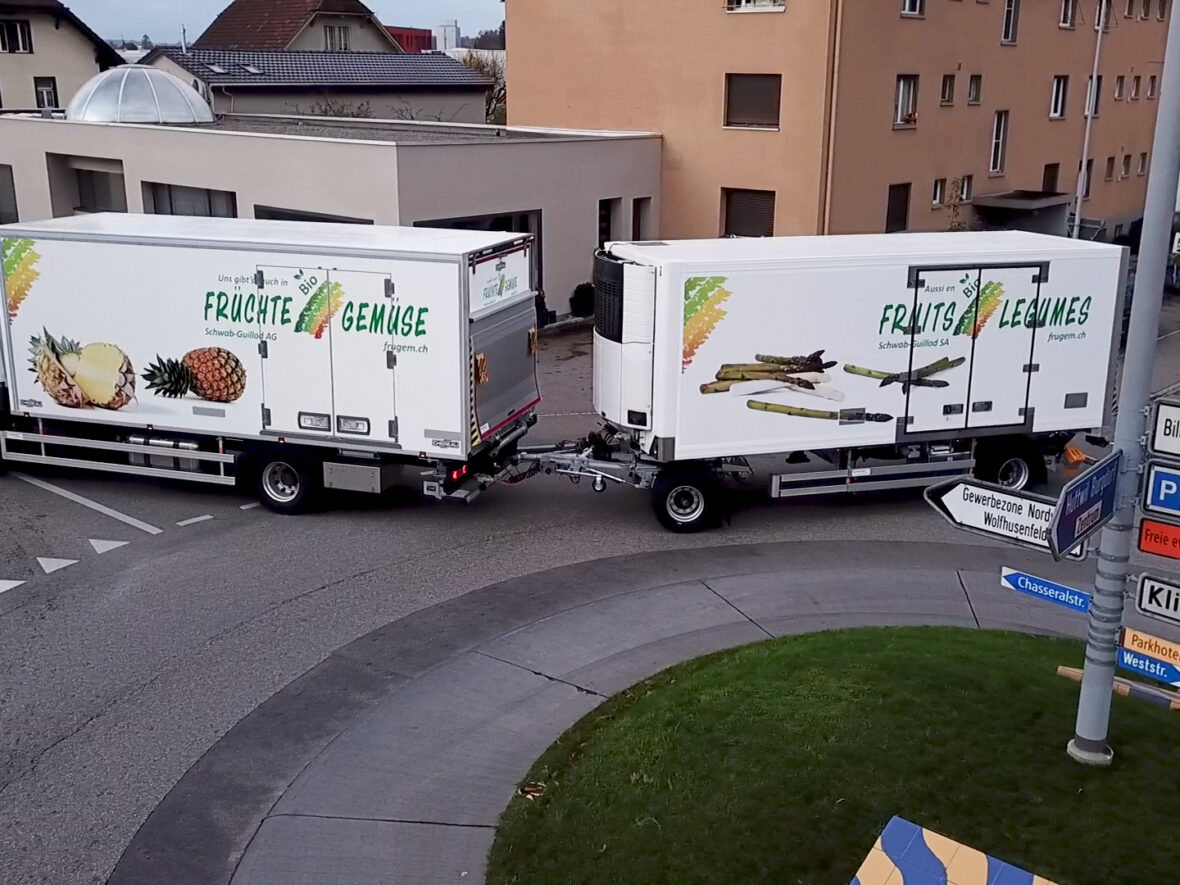 Um die Früchte- und Gemüselieferungen zu optimieren, setzt der innovative Grossverteiler Schwab-Guillod AG auf den Dolly City-Sattelanhänger der Calag. Die Anhänger mit dem Dolly können für die Feinverteilung in innerstädtischen Regionen schnell zu Aufliegern umgebaut und an eine Sattelzugmaschine angekoppelt werden. Dadurch steigt die Effizienz beim Ausliefern und ein zeitintensives Umladen der Ware mit potentiellem Unterbruch der Kühlkette wird verhindert.