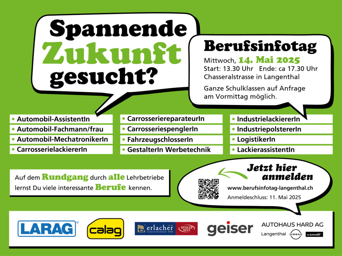 Am Mittwoch, 14. Mai 2025 laden die Rudolf Geiser AG, Autohaus Hard AG, Erlacher Polster GmbH, LARAG AG und Calag Carrosserie Langenthal AG auf einen Rundgang durch die Firmen ein. Die teilnehmenden Personen (SchülerInnen, Eltern, Lehrpersonen) erhalten spannende Informationen zu den verschiedenen handwerklichen Berufen und natürlich einmalige Einblicke in die Langenthaler Unternehmen.